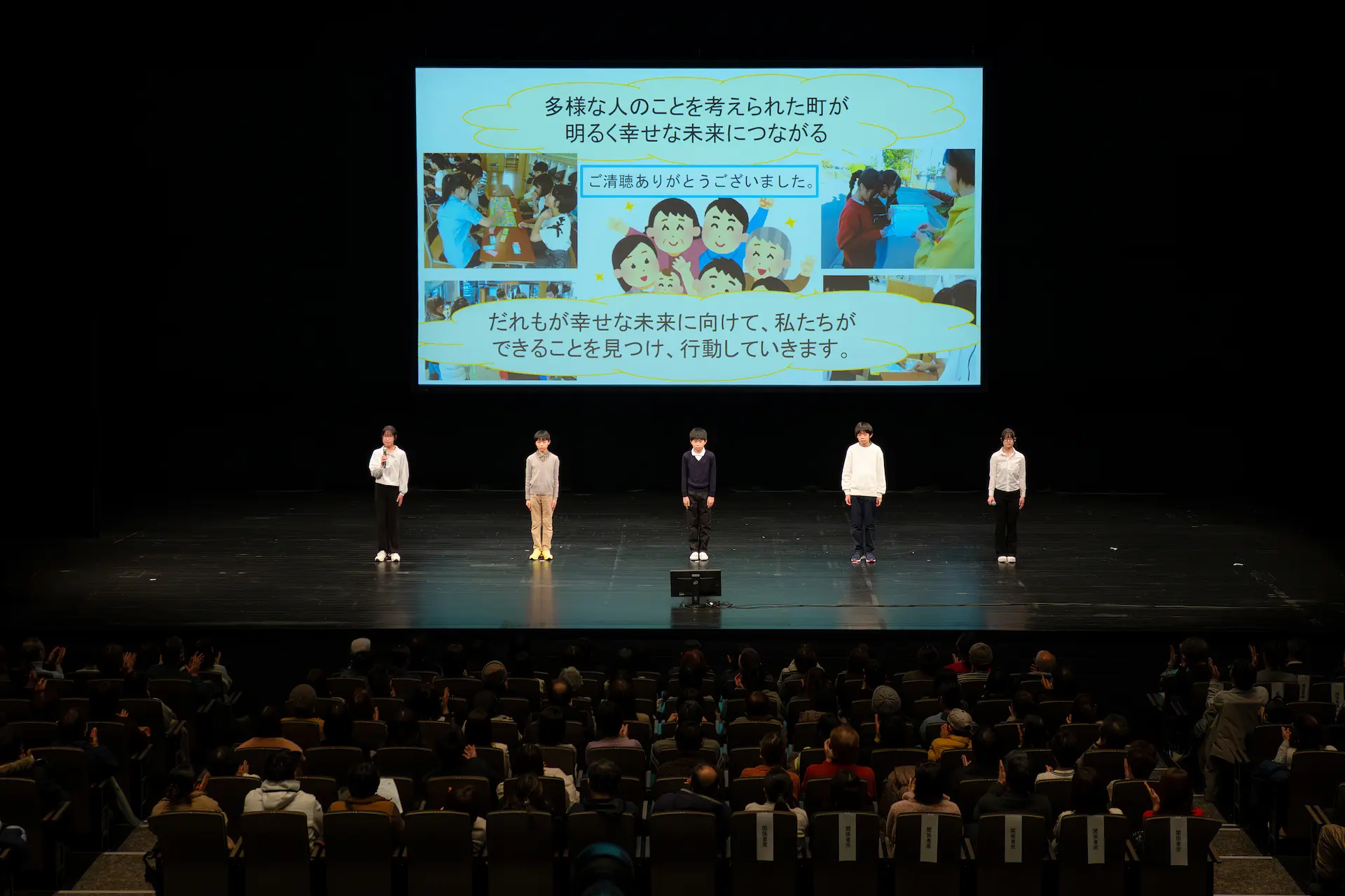 「総合的な学習の時間」で学んだ成果を発表しました。海洋プラスチック問題を知ったことで、海岸清掃やリサイクル、マイバッグ使用など、自分にできる行動を実践していると紹介。また転倒した高齢者を助けた経験からユニバーサルデザインに関心を持ち、多様な人が安心して暮らせるまちづくりの必要性を実感。「将来を担う一人として、誰もが幸せに生きられる社会を目指したい」と結びました。