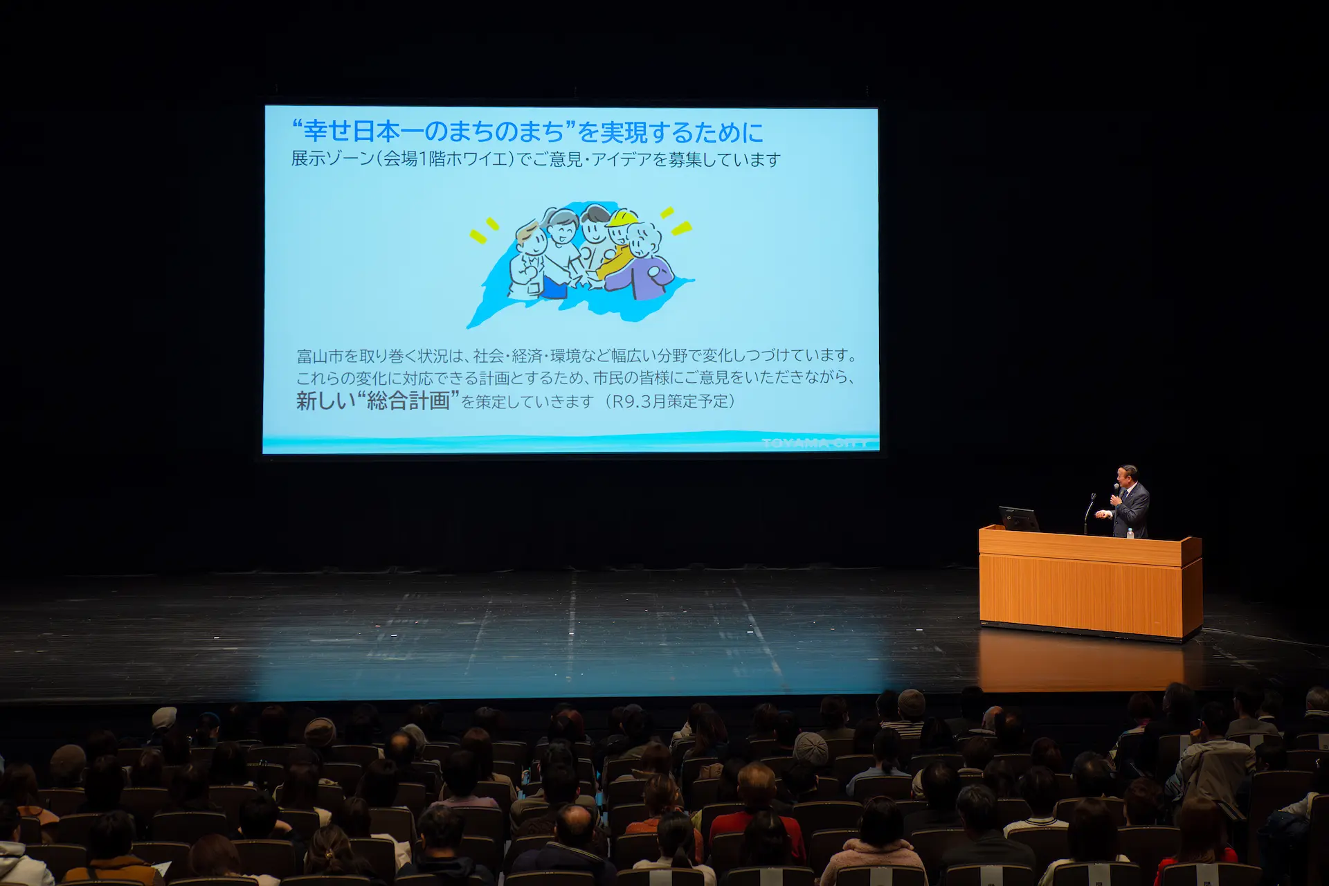 藤井市長は、市の歩みと展望を語りました。SDGs未来都市とやまとしての取り組みやCOP30に参加したことを紹介し、「一人ひとりが自分なりの一歩を踏み出すことが大事」と呼びかけました。2027年度から始まる第3次総合計画では「幸せ日本一のまち・とやま」を掲げて14の政策分野を設け「市民の意見を反映し、子どもたちに誇れる明るい未来を築く」と決意を語りました。環境分野では、再エネ活用や資源循環推進で快適な生活環境を守ると強調。結婚・出産・子育て分野では、若者が将来に希望を持ち、安心して家庭を築き子育てできる切れ目のない支援体制を整える方針を示しました。